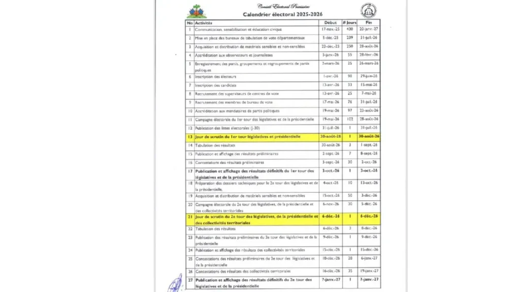 Port-au-Prince, Mercredi 24 décembre 2025 – Le Conseil électoral provisoire (CEP) a rendu public le calendrier des prochaines élections en Haïti, fixant les principales étapes du processus électoral devant aboutir à l’élection des autorités en 2026.