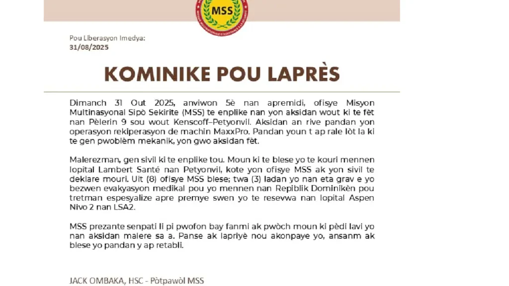 L’accident a coûté la vie à un officier de la MMAS et à un citoyen haïtien, tandis que huit autres officiers ont été blessés, dont trois grièvement. Les blessés ont été rapidement évacués vers l’hôpital Aspen de niveau 2, LSA1, pour recevoir des soins d’urgence. Des photos et vidéos des véhicules accidentés ont largement circulé sur les réseaux sociaux, montrant notamment des policiers kényans évacués à l’arrière d’un pickup. Des témoins ont confirmé que certains agents se trouvaient dans un état critique, et au moins deux civils ont également perdu la vie. Rapporte Le Nouvelliste.
